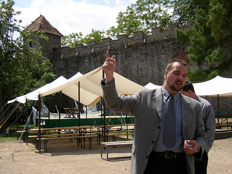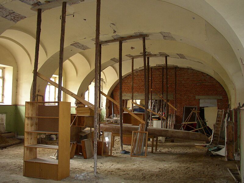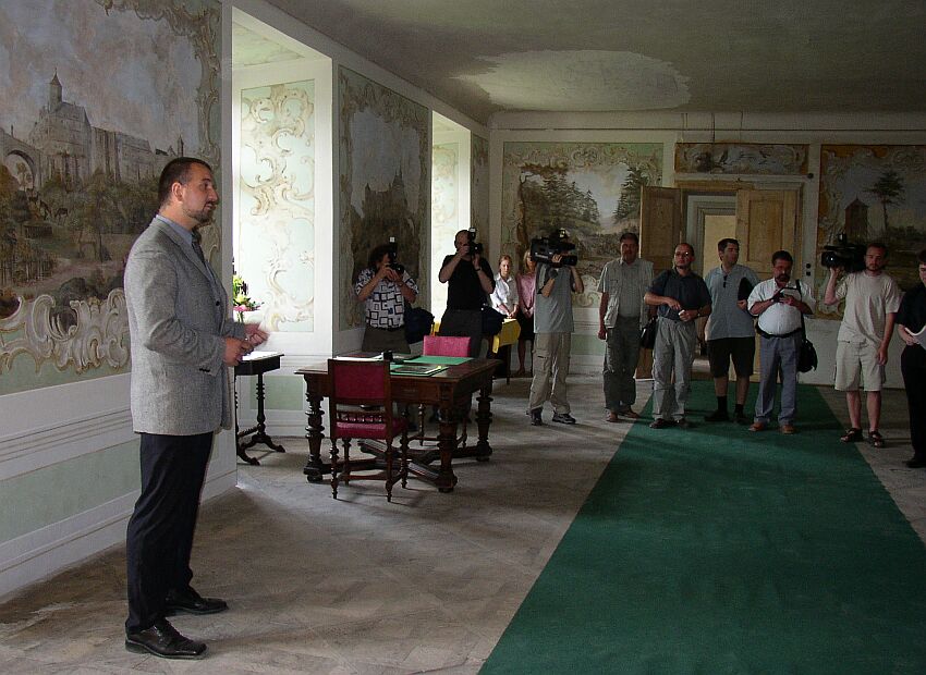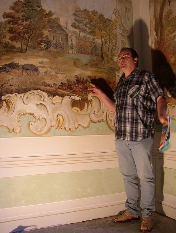 Pan kastelán vítá novináře v hradní jídelně. Vzadu na stropě je viditelné betonové břicho vzniklé stečením z mohutných betonových nánosů, kterými jsou zdi na hradě často doslova zadušeny. Bude muset být opatrně odstraněno při zakrytí maleb. |