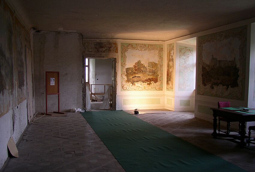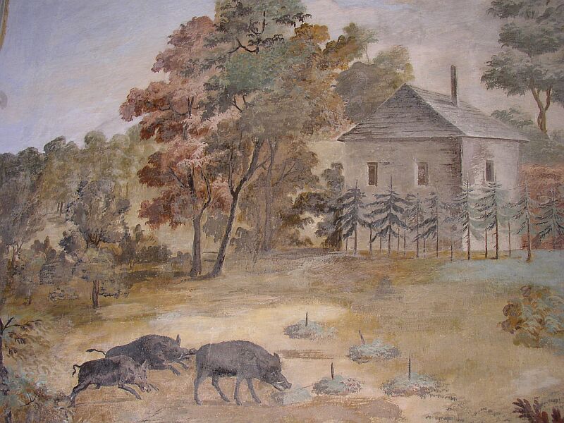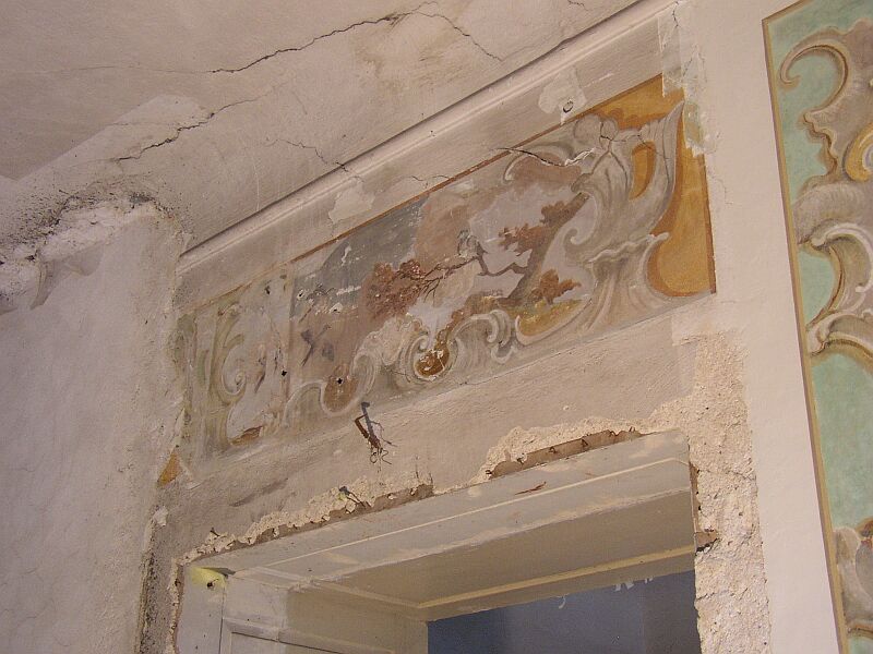 Zatím stále zničená malba nade dveřmi. |