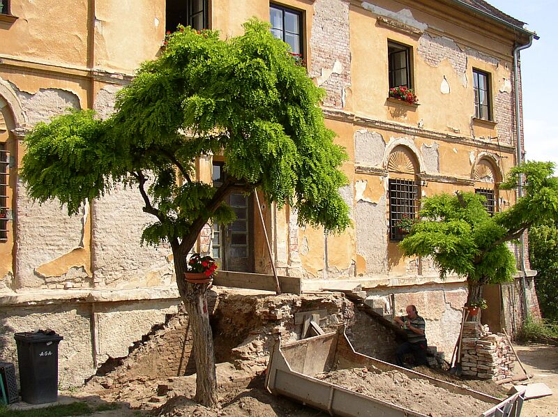 Vstup do purkrabství (obytná část hradu pro kastelána). Levá část schodiště je spadená díky podemletí vodou, která je zde nedokonale odváděna. |